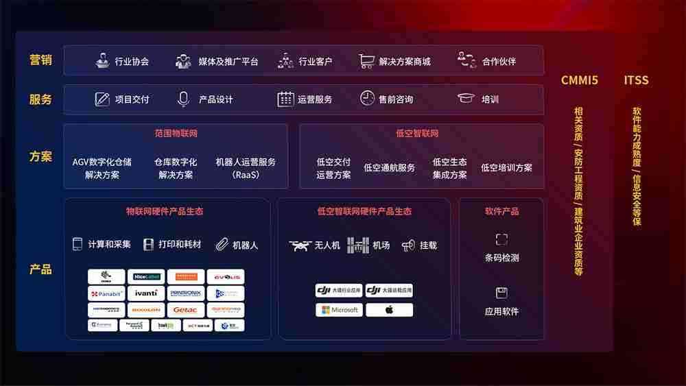 聚合国内外先进的物联网硬件产品品牌,,,,聚焦数字化仓储、、、机器人运营、、低空智联网等领域,,共同打造适合客户业务场景的解决方案并提供交付服务